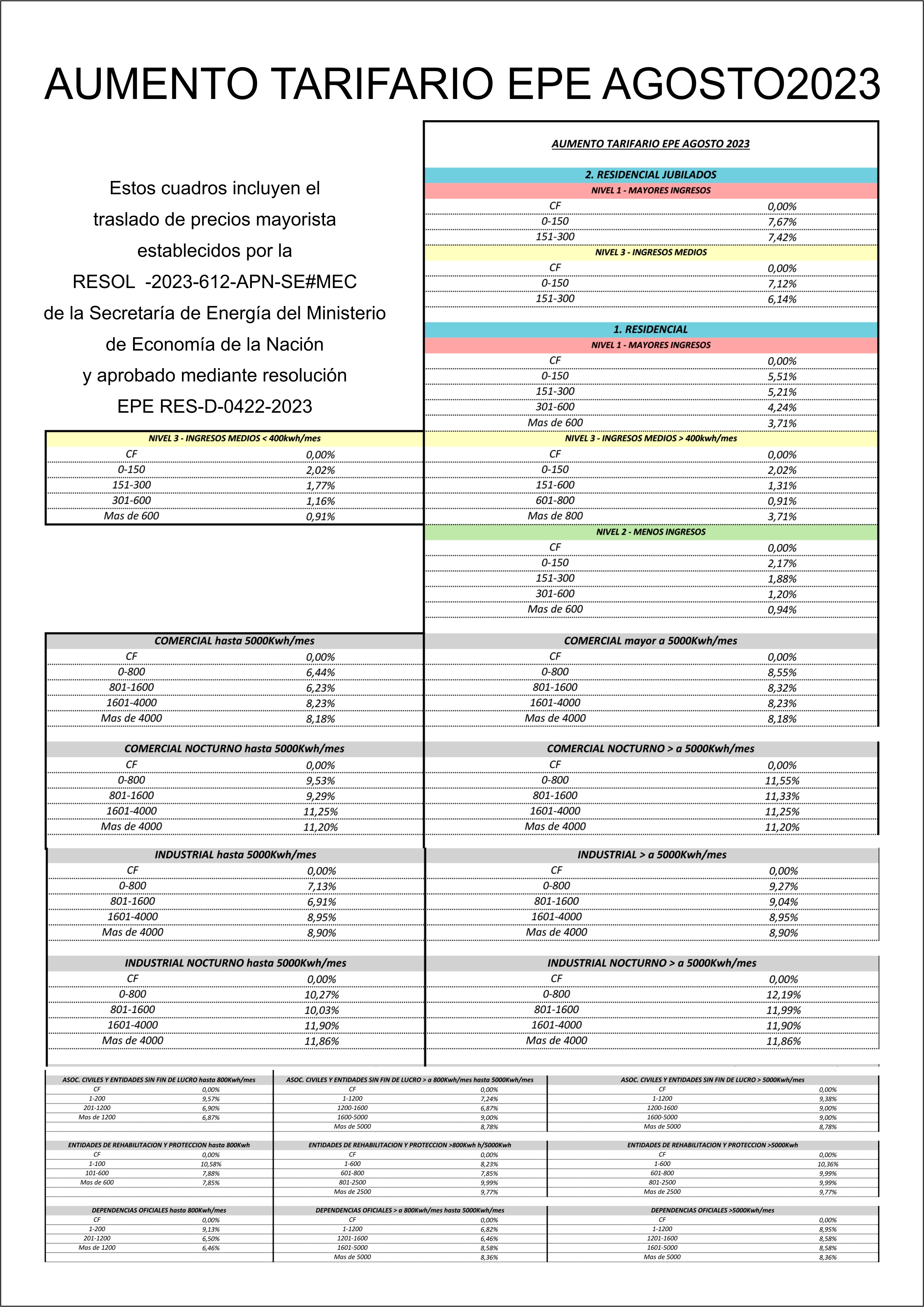 Según lo informado por la Empresa Provincial de la Energía de Santa Fe la tarifa aumentará un 4,6% en promedio a partir de agosto a raíz de los nuevos precios de la electricidad fijados por la Secretaría de Energía de la Nación, en el marco de la reprogramación trimestral para el período comprendido desde el 1º de agosto y el 31 de octubre. Nuestra Cooperativa trasladara el mismo incremento a sus usuarios.