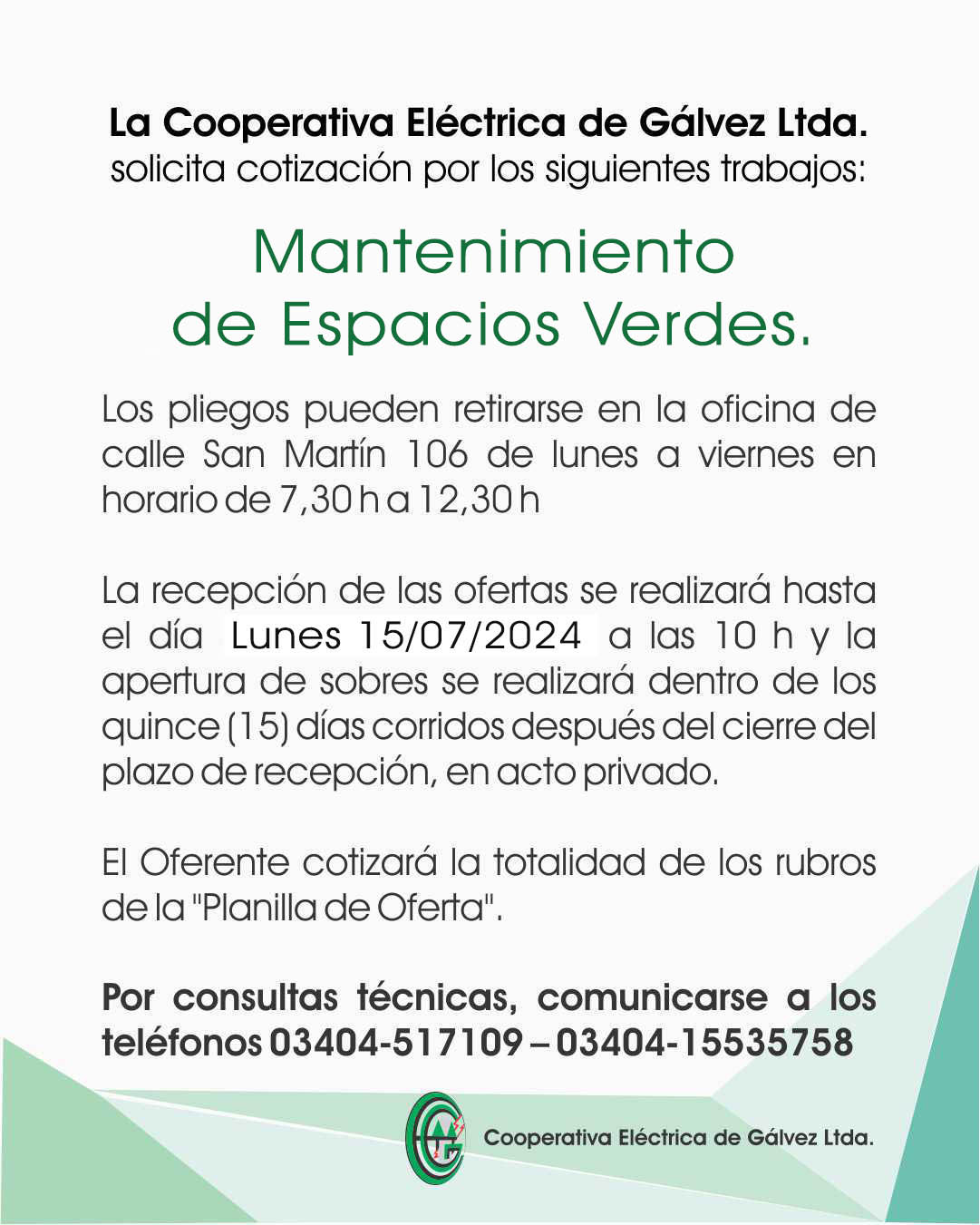 Por el presente Concurso Privado La COOPERATIVA ELECTRICA DE GALVEZ LTDA solicita cotización por desmalezado, corte de pasto, acarreo de descartes y fumigado en los predios de su propiedad.