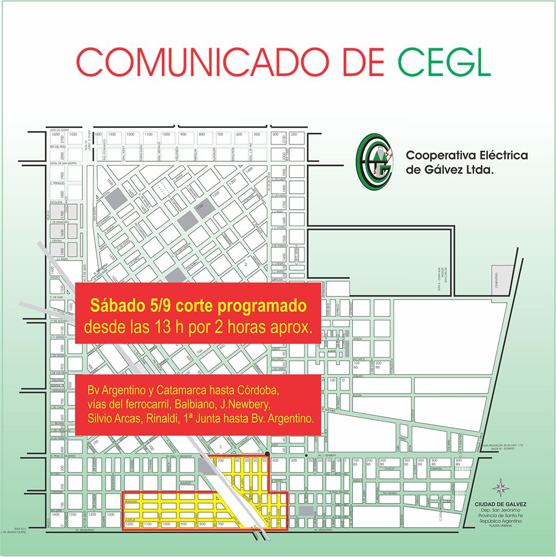 Este Sábado 5, a partir de las 13:00 h y con una duración aproximada de 2 h, realizaremos un corte de energía en la zona de la imagen adjunta.