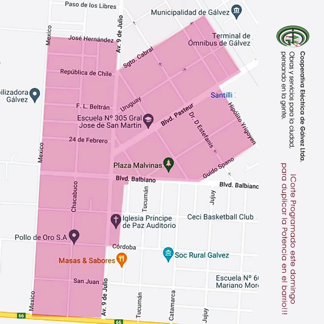 El Domingo 04/08 a las 07:30hs se realizará un corte de energía en la zona de la imagen adjunta. El mismo tendrá una duración aproximada de 4 h.