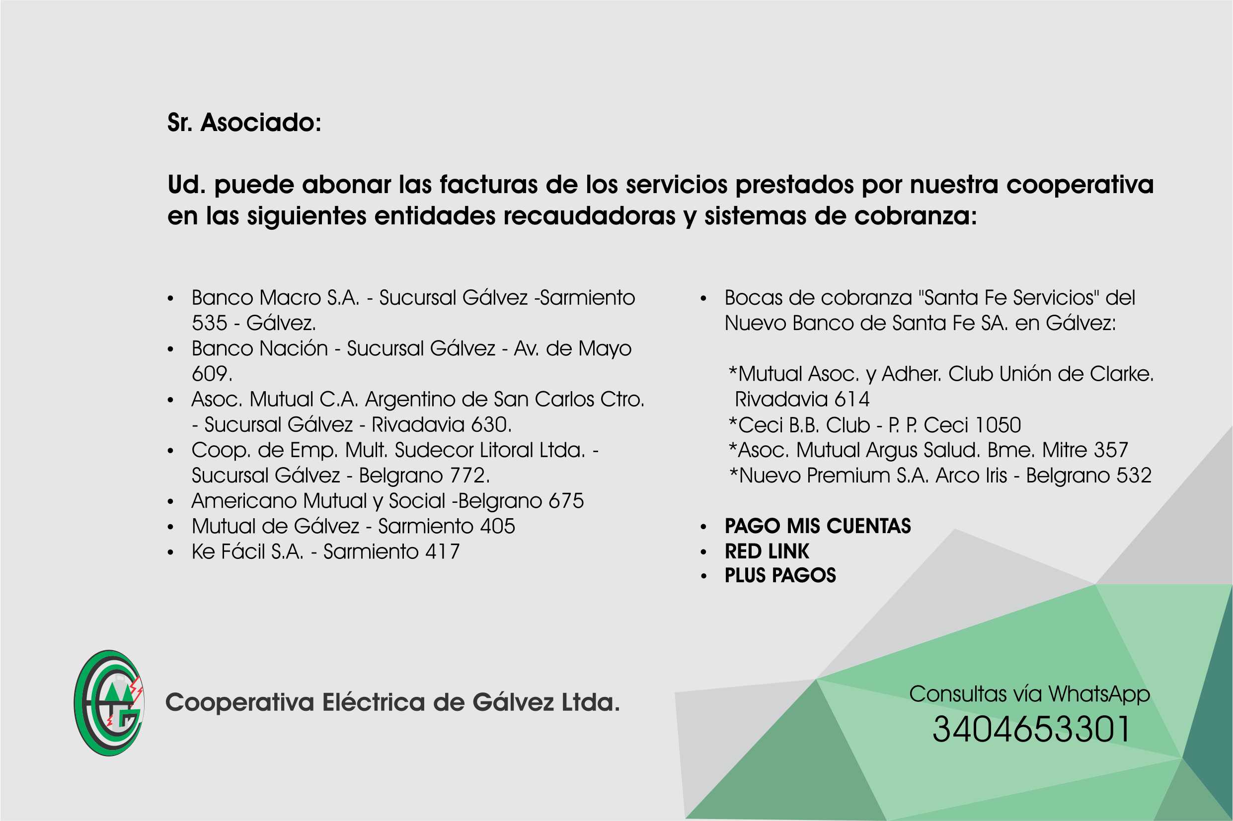 Recordamos las entidades y medios de pago habilitados para efectuar la cobranza de los servicios que presta nuestra Cooperativa.