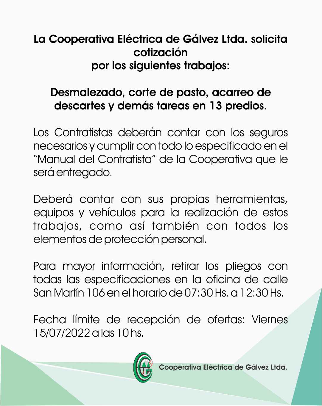 La Cooperativa Eléctrica de Gálvez Ltda. solicita cotización por los siguientes trabajos: